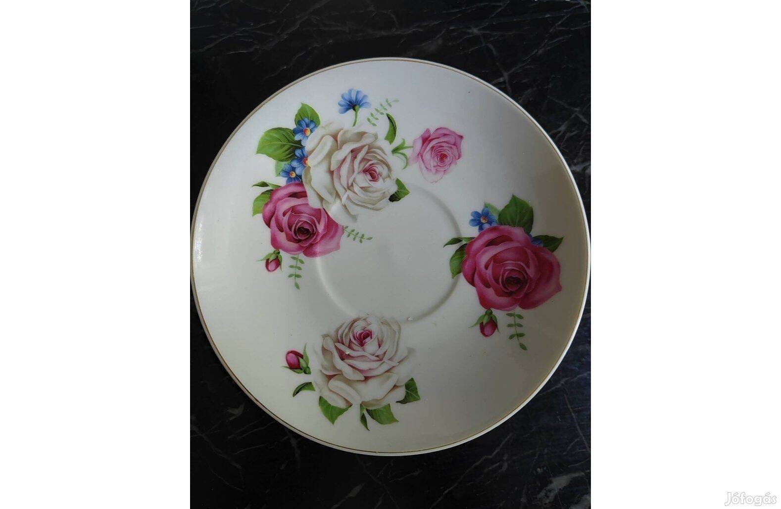 Rózsás porcelán kistányér, Teás csészealj 6 db. R. K. jelzéssel