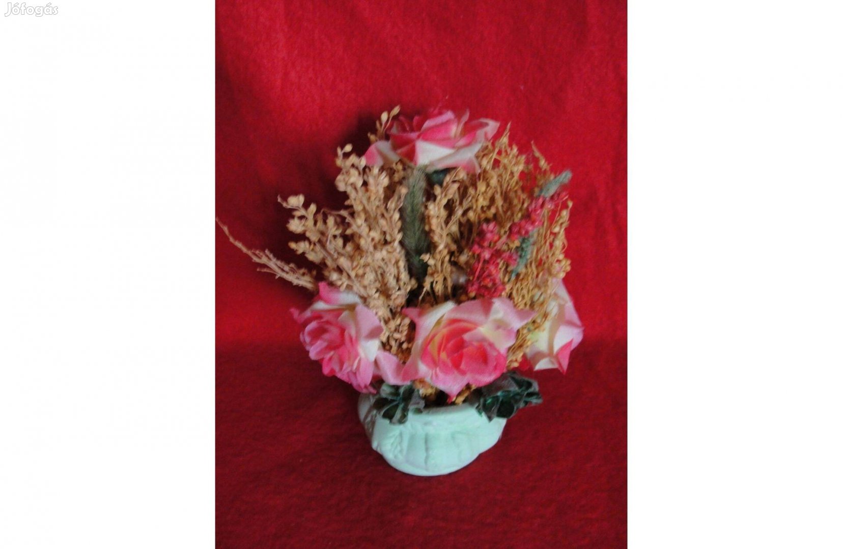 Rózsás virág csokor asztali dísz mini kerámia kaspóban 14 cm