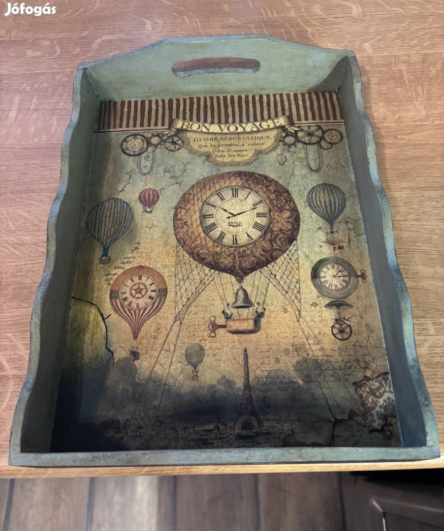 Eladó dekorált fa tálca. Krétafestékkel festve, rizspapírral díszítve az alja és wax-al lett fedve.