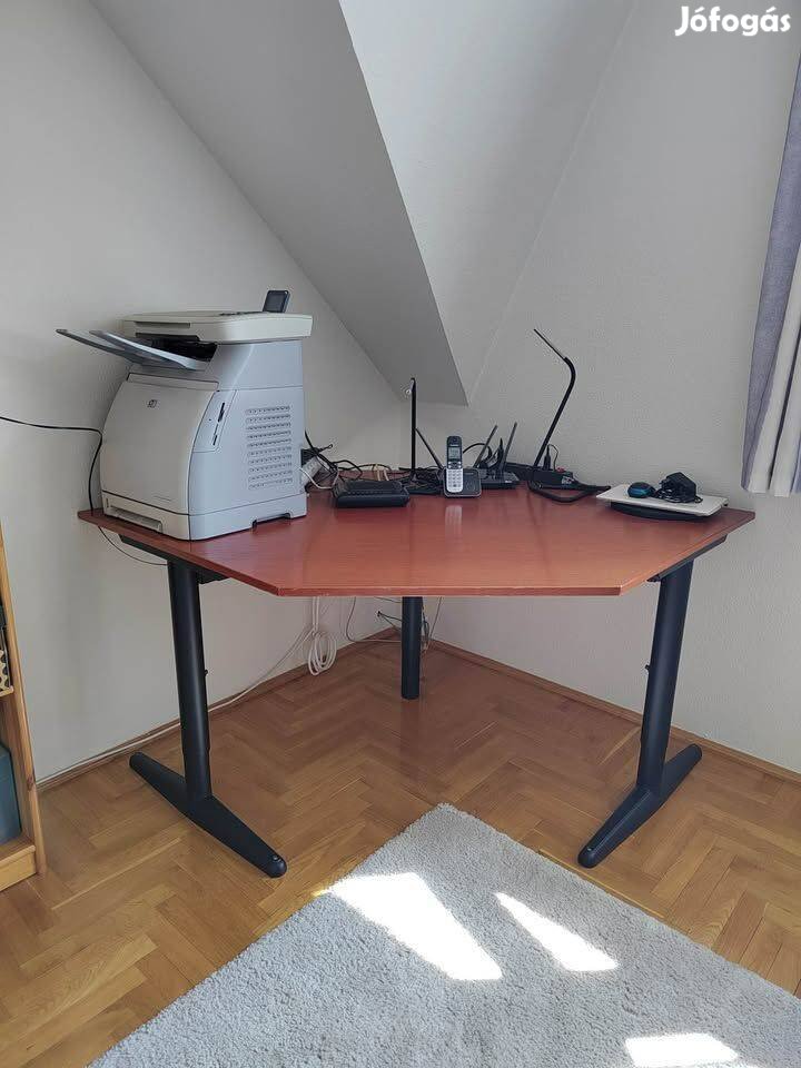 Eladó sarok számítógépasztal, mahagóni színű fa asztallap, fekete fém állítható lábakkal.