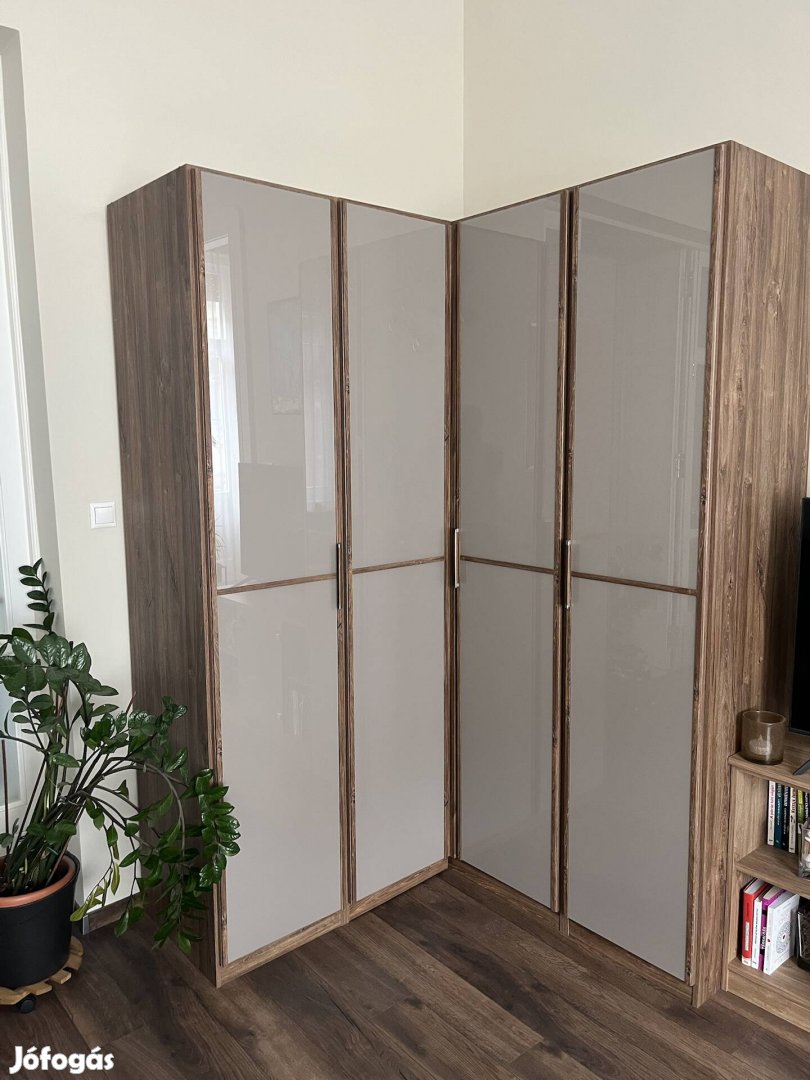 A sarokszekrény mérete 150x150 cm, magasság: 230 cm. L alakúvá is alakítható.