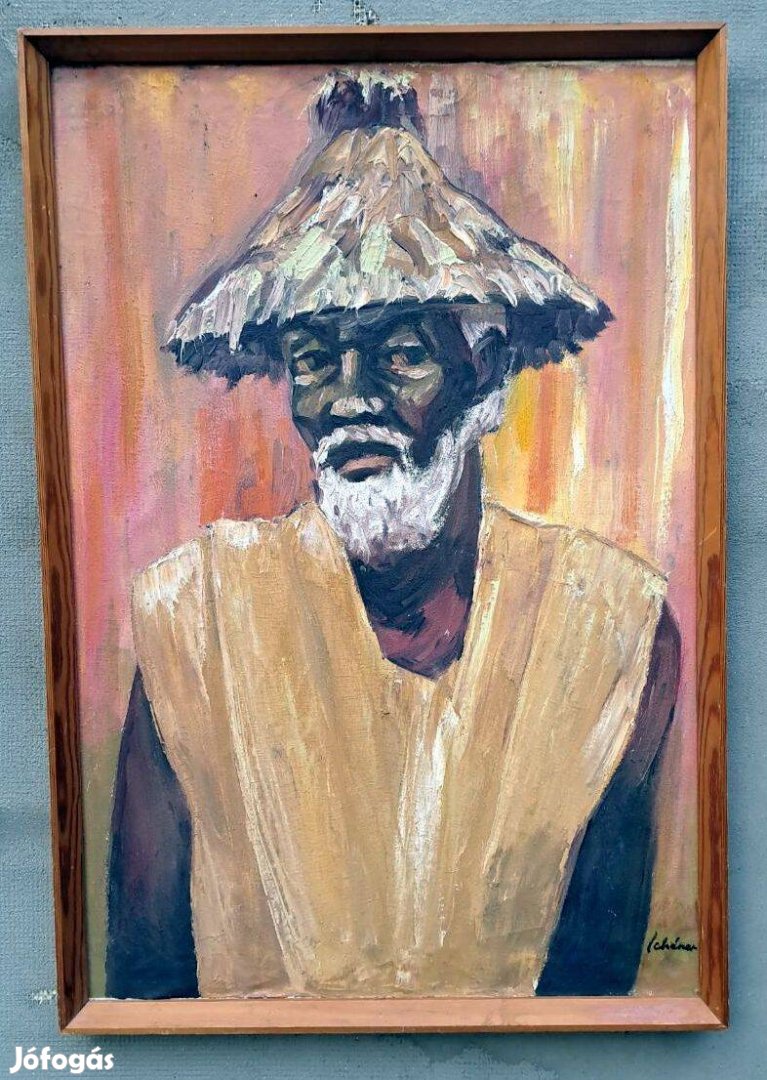 Schéner Mihály:Néger férfi portré szalmakalapban Olaj ,vászon . Mérete: 54x78 cm.