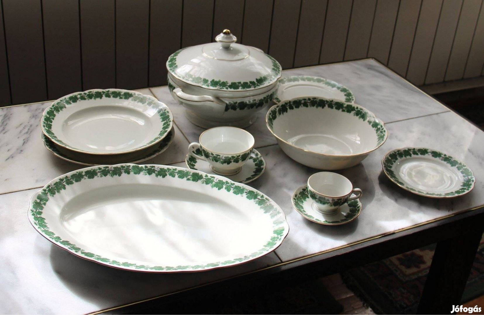 Szőlőlevél mintás antik porcelán étkészlet, az 1900-as évek első feléből származik, és keresett antikvitásnak számít. A porcelánok szélén körbefutó, zöld színű szőlőlevelekből és indákból álló koszorú látható. Alján a gyártó: Schönwald, számozott darabok