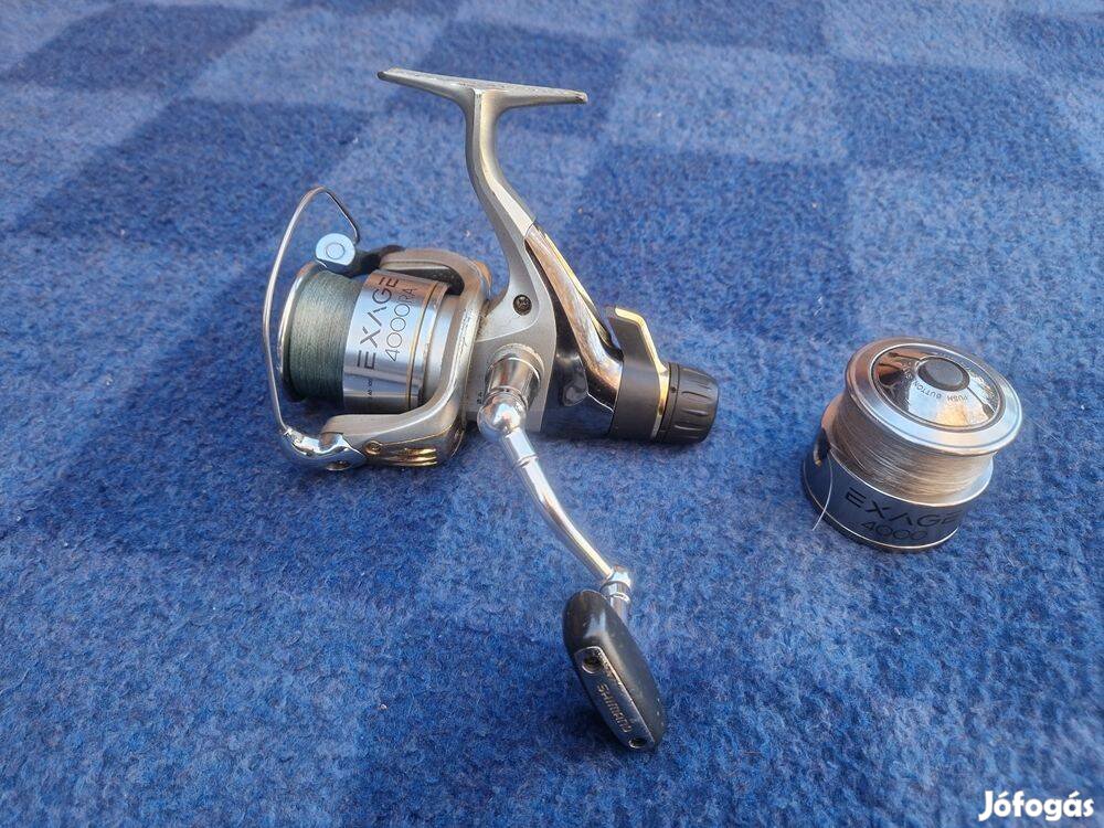 Eladó 1 db Shimano Exage 4000RA harcifékes orsó. Szép futású, hibátlan működésű, az éleken némi festékkopás látható. 40-es méretű, univerzális felhasználású. 4+1 csapágyas, 0.25 mm / 260 m kapacitású. Fém pótdobja van, doboza nincs.