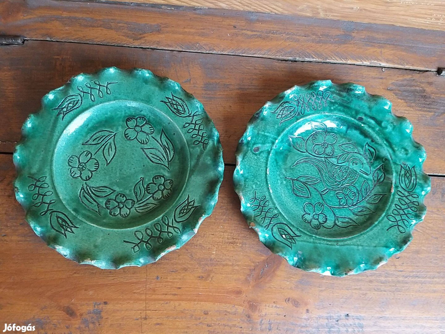 2 db. zöld mázas tányér, fodros széllel, kisebb mázkopásokkal.