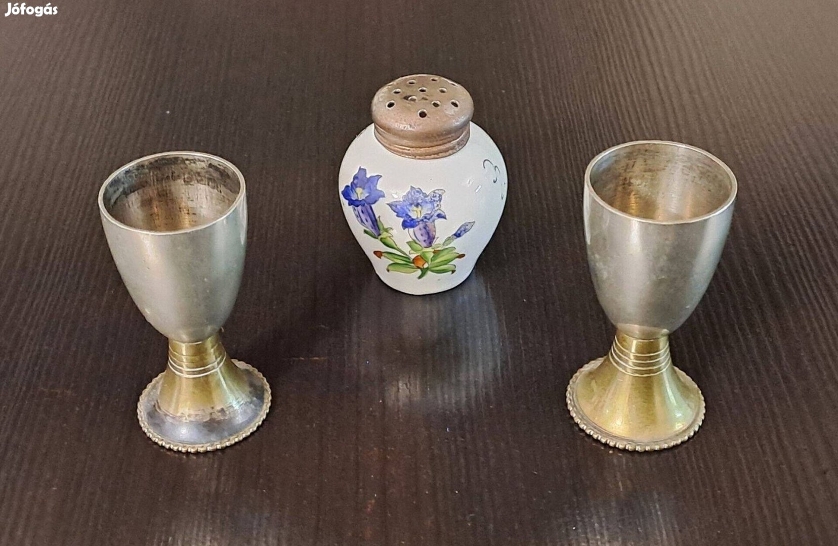 Porcelán sótartó és két kis kupica vagy fogpiszkálo tartó.