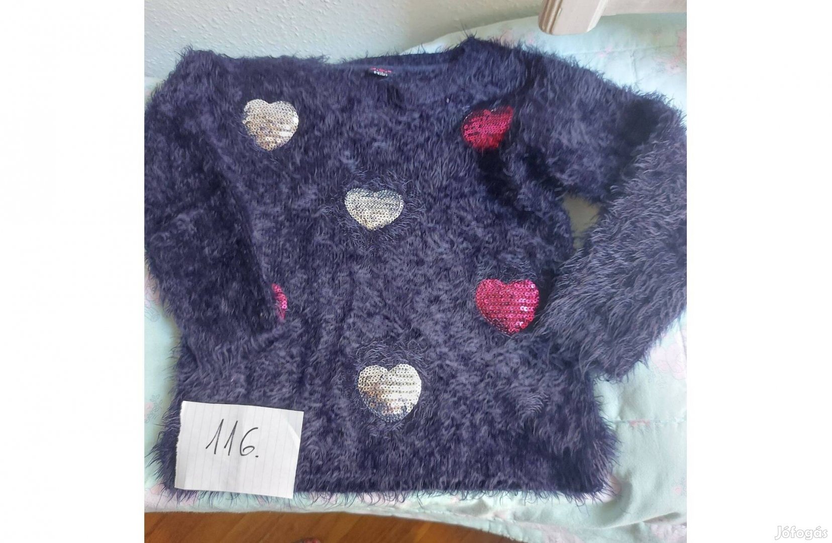 Sötétkék 116-os méretű kislány felső szívecske flitterekkel