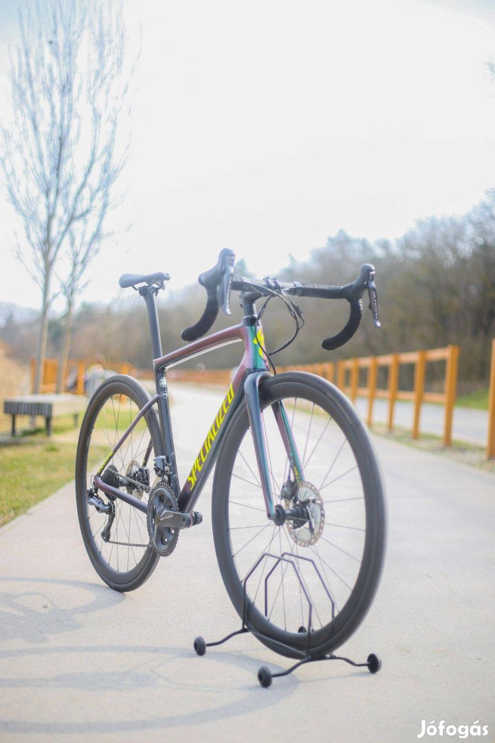 Eladó egy Specialized Tarmac SL6, amelyet SL8 Expert szintre fejlesztettek. A kerékpár elektromos Shimano Ultegra Di2 váltással és karbon kerekekkel rendelkezik, gyári Shimano töltő természetesen jár mellé. A kormányon a hüvelykujjaknál extra beépített gombok találhatók, amelyek például Garmin komputer lapozására is alkalmasak. A váz kb 170-180 centi között ideális