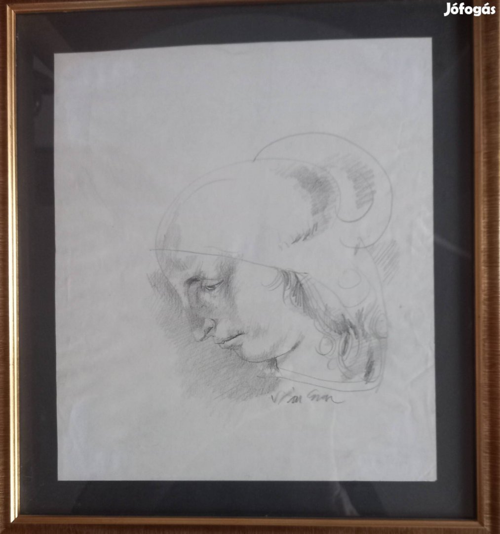 Női arc 25x28 cm méretű ceruza rajz papiron Száz Endre aláírással. Bekeretezve elől-hátul üveg lapok között. Galériában vásárolt számlával 1993-ban