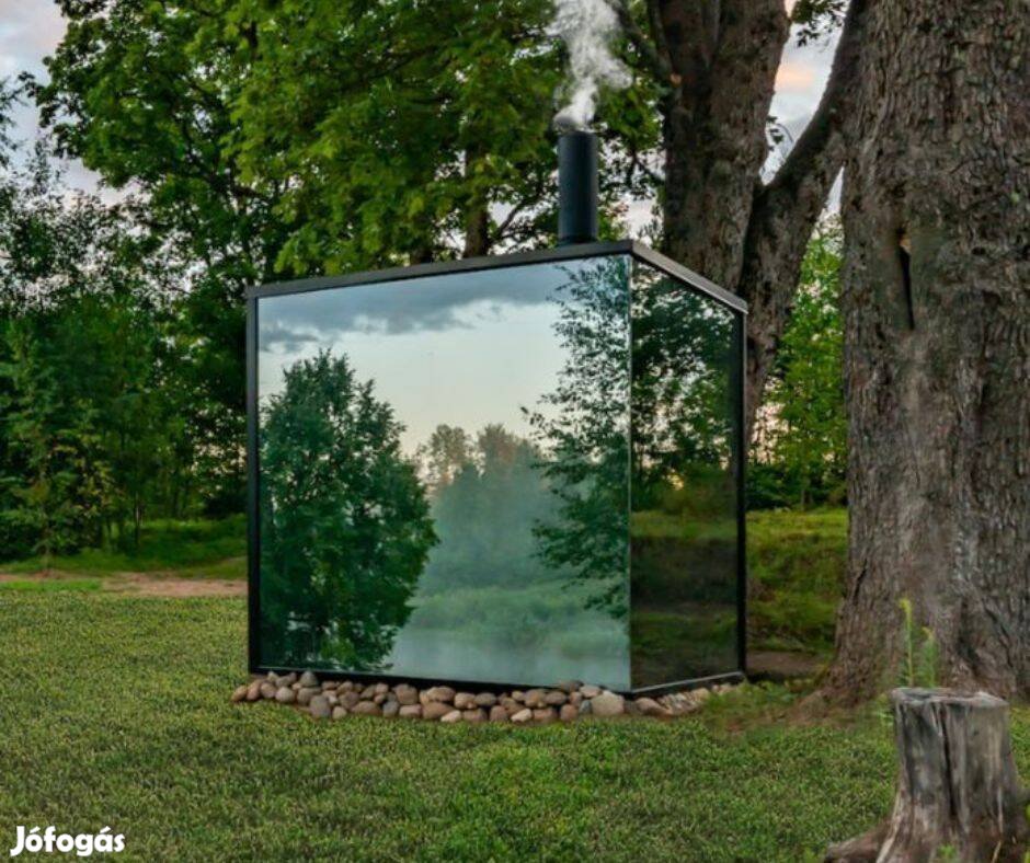 Eladó / rendelhető prémium Fjord tükörszauna, amely egyedi megjelenésével és modern kialakításával különleges wellness élményt nyújt kertben, nyaralónál vagy vendégházaknál.