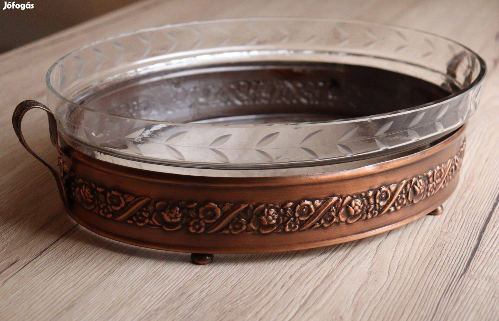 Eladó a képen látható szecessziós vörösréz üvegbetétes tál. Méretei 33 x 20 cm.