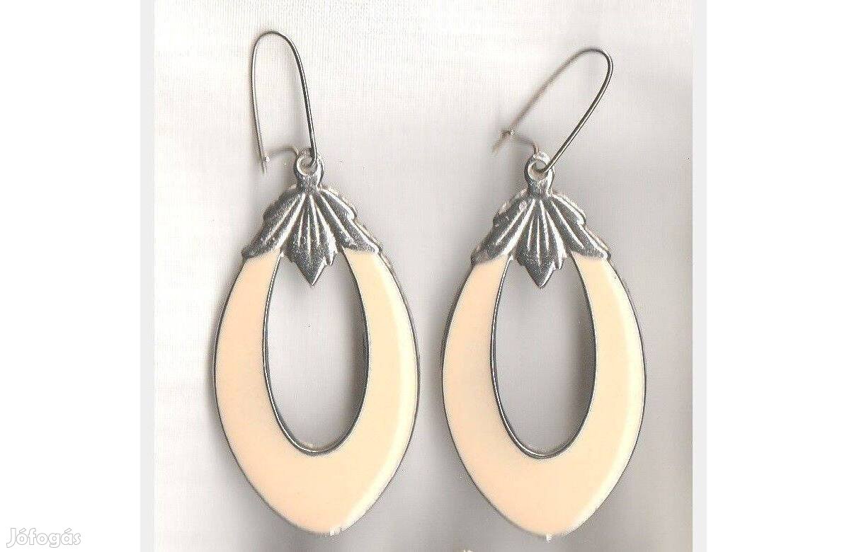 Szép egyedi, tűzzománc technikával készült ovális fülbevaló, törtfehér színű, 6 cm hosszú, 2,5 cm széles.