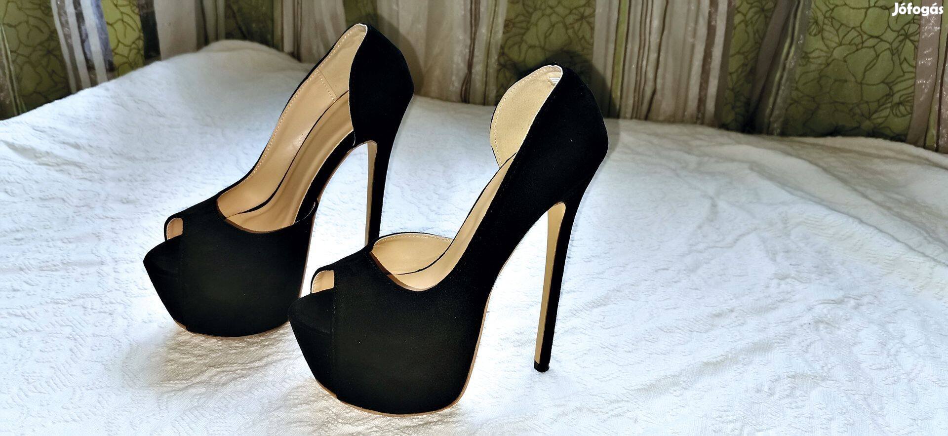 Új állapotban, dobozában és külön-külön cipő zsákokban női fekete extra magas sarkú cipő, szandál eladó.