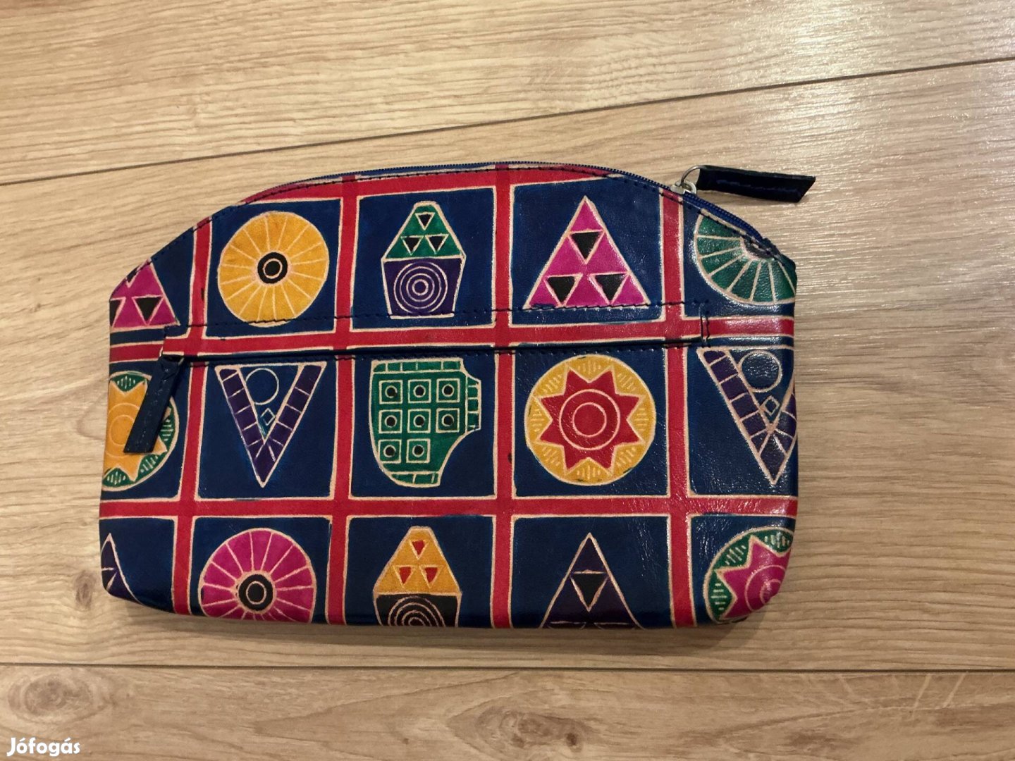 Vidám, színes bőr neszeszer. Egy nagyobb és egy kisebb cipzáras rekesszel.