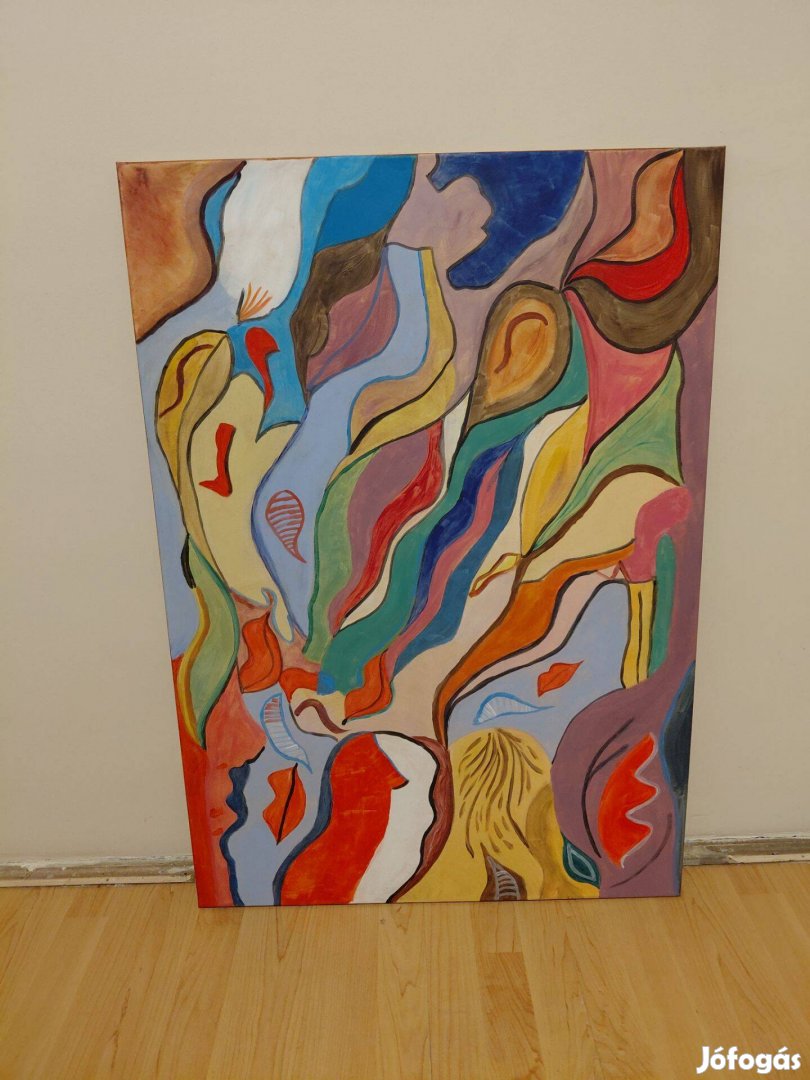 Szines formák akril vászon. A mérete 100x70cm.Az alkotás absztrakt expresszionista jegyeket mutat, amelyeket az élénk színek dinamikus kavalkádja jellemez.