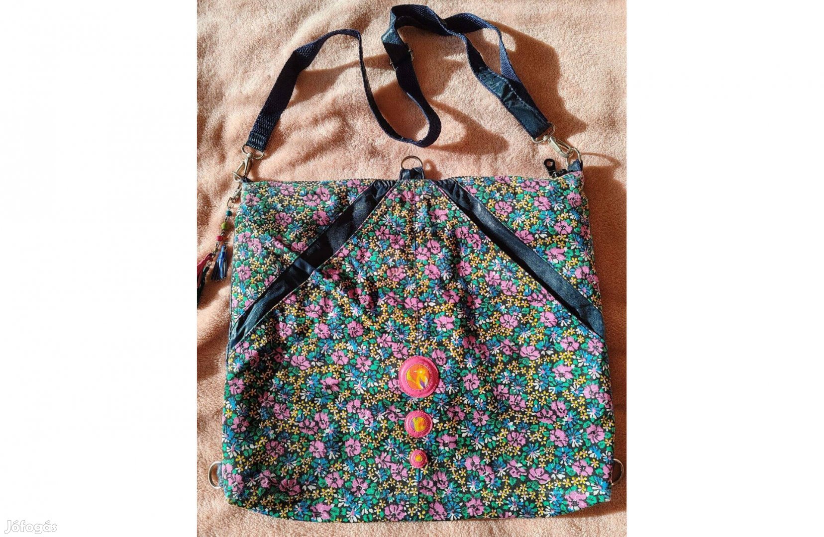 Kifogástalan állapotban lévő variálható, két oldalán más színű táska sok zsebbel és rojt dísszel. A táskapántok végén található karabínerrel válltáskává, illetve hátizsákká alakítható. Az alapanyaga tarka, virágmintás vászon és sötétkék, fényes felületű orkánszövet. A bélése zöld orkánszövet. A cipzárral záródó főzsebben két kicsi, valamint egy cipzáros nagyobb zseb található. Külső oldalán elöl és hátul is van 2-2 zseb. Méretek: magassága 30 cm, szélessége 34 cm, mélysége 5 cm. A táskapántok hossza 61-110 cm között állítható. Kímélő programon mosógépben mosható.