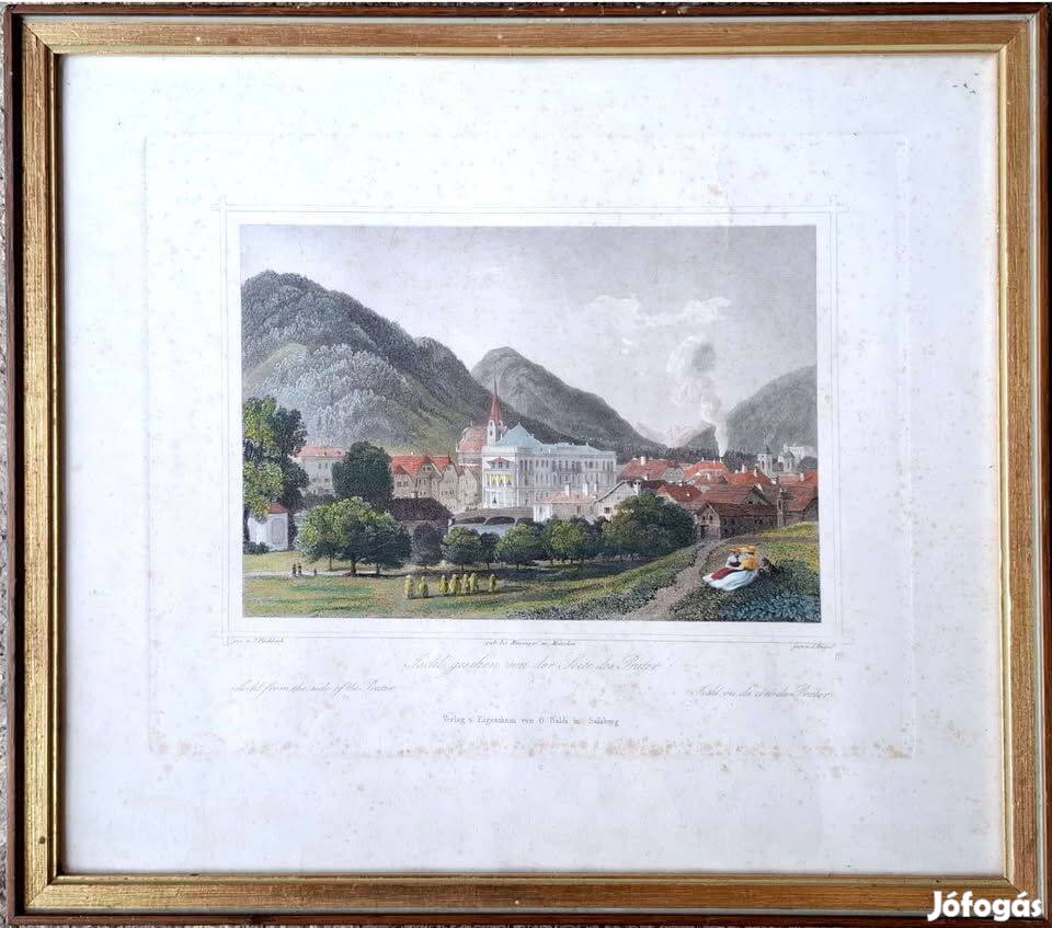 Gyönyörű, finom részletekkel megmunkált színes rézkarc, amely egy békés hegyvidéki város látképét ábrázolja. A háttérben magasodó zöld hegyek és a vöröstetős házak harmonikus összhangja különleges, nyugodt atmoszférát teremt.