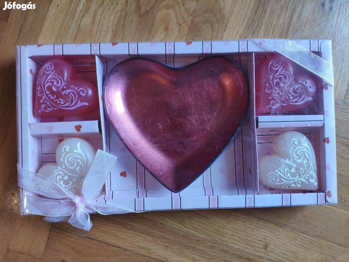 Eladó szív alakú gyertya szett (2 db fehér és 2 db piros) szív alakú gyertyatartóval. Bontatlan csomagolás.