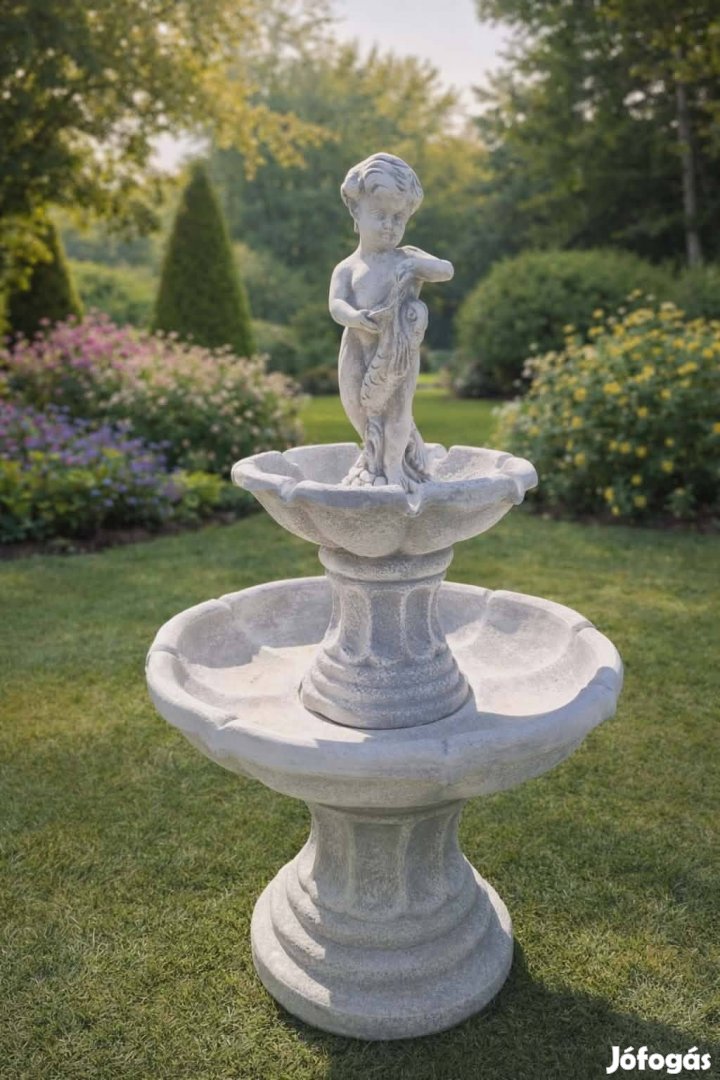 Eladó a képen látható, elegáns megjelenésű 2 tálcás szökőkút puttó figurával, amely romantikus, klasszikus hangulatot varázsol bármely kertbe.