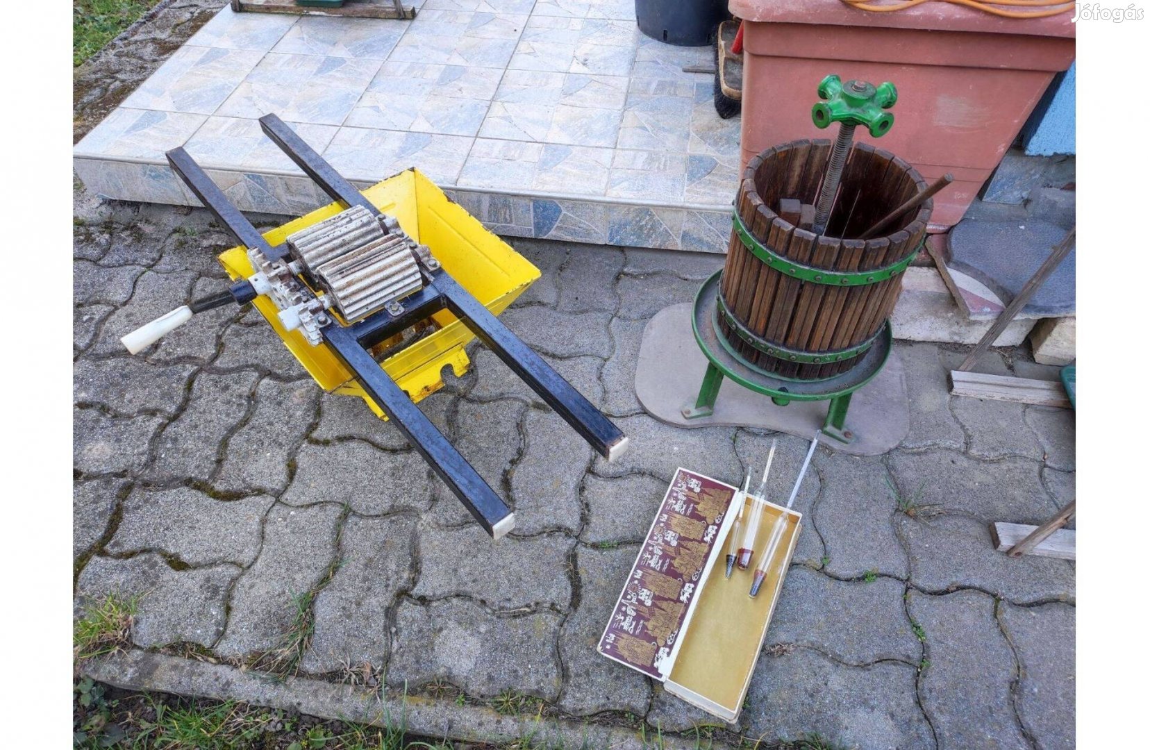 Édesapám hagyatékából eladók a képeken látható 25-30 literes szőlőprés, szőlődaráló borokhoz és egyéb szeszekhez használatos fokolókkal együtt. Mindegyik eszköz még ma is kifogástalanul használható. Árnak az össz. egészre 30.000 Ft-ot mondok, de természetesen lehet szó megegyezésről, a végső ár személyes megtekintés és megegyezés alapján dől el. Az egyes dolgok természetesen külön-külön is megvásárolhatók. Akit bármelyik érdekel, kérem keressen meg a -es számon (Kriszti Budapest 22. kerület).