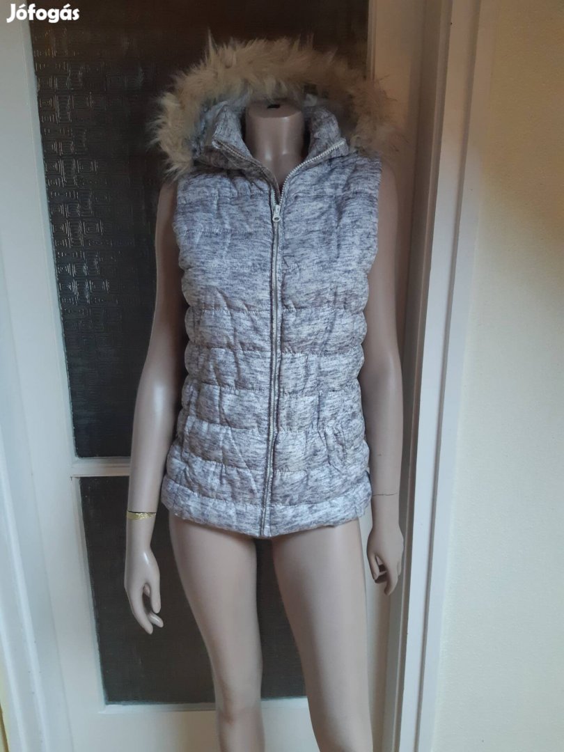Eladó egy elegáns és meleg, szürke színű, szőrme kapucnis, ujjatlan steppelt hosszú mellény. Kényelmes viselet hűvösebb napokra.