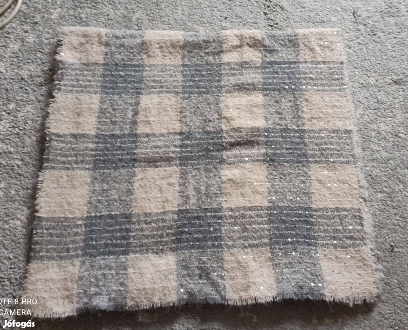 Szürke kockás flitterekkel díszített meleg kötött sál új állapotú 2500 Ft-ért eladó.