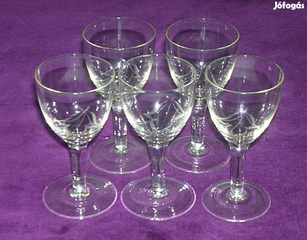 Eladó a képen látható 5 darab csiszolt, talpas üveg pohár. Magasságuk 9 cm.
