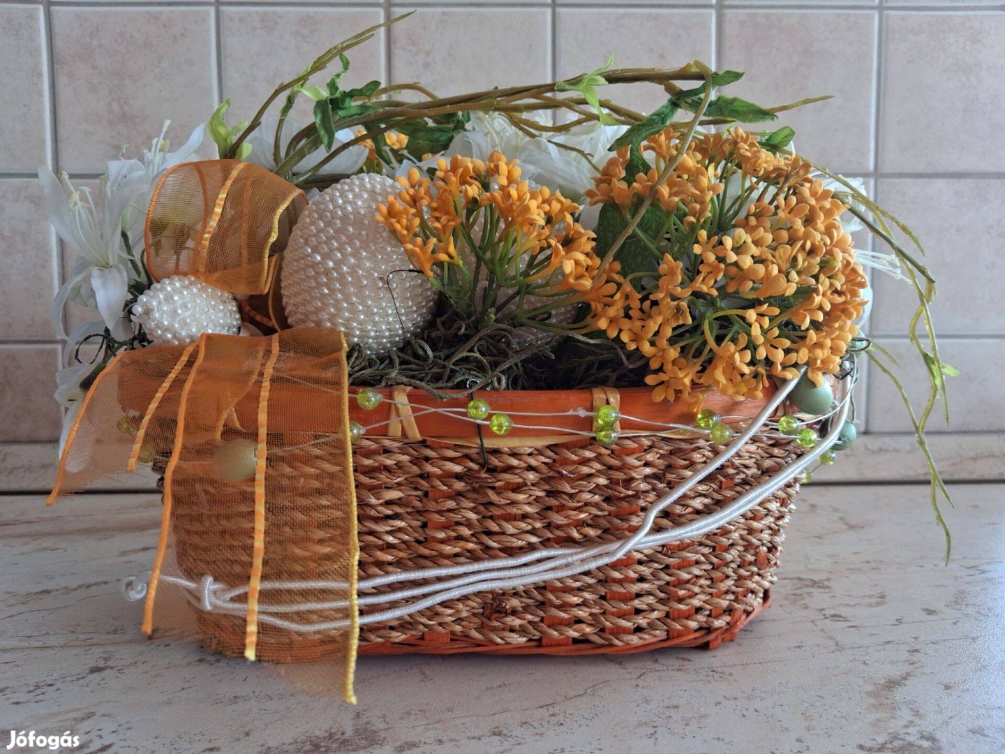 Eladó a fotón látható dekoratőr által készített dekorációs kosár.