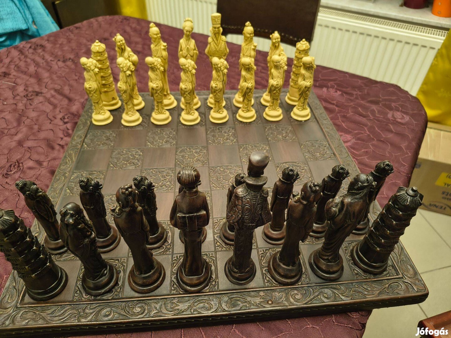 Eladó 40 ezer forintért a fotókon latható távol-keleti, nagyméretű sakk készlet. 45 *45 cm a tábla mérete. A figurák 11,5 cm - 16,5 cm nagyságúak. A sakk figurák tárolására egy nagyméretű fa doboz áll rendelkezésre. A figurák anyaga nem egyértelmű, talán műgyanta, a tábla lehet, hogy fa. Az egyik bábu minimális sérülése fotózva. Átvehető Újpesten. Nem postázom!