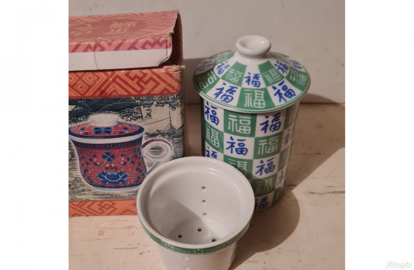 Eladó egy új teásbögre szűrővel és fedéllel.