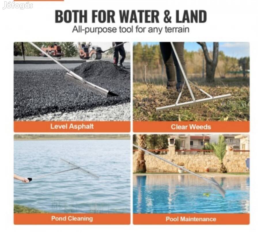 Alumínium , nagyméretű terepgereblye, amely kiválóan alkalmas talajrendezésre és tavi gyomirtásra egyaránt.