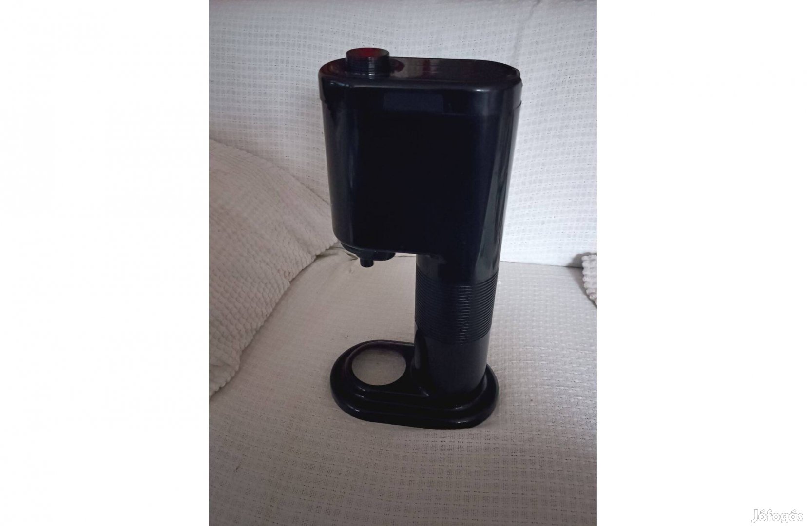 A szódagépbe csak betöltjük a tetején a 2,5 dl vizet, megnyomjuk a gombot egyszer vagy többször a kívánt erősséghez és alul már engedhető a friss szóda.