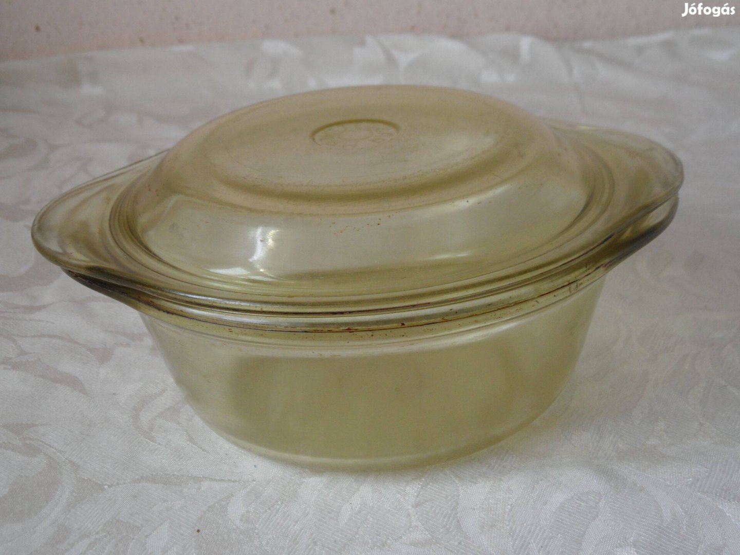 A képen látható Thermraso régebbi vastagfalú jénai tál eladó. Felülete helyenként karcos, de a tál hibátlan.