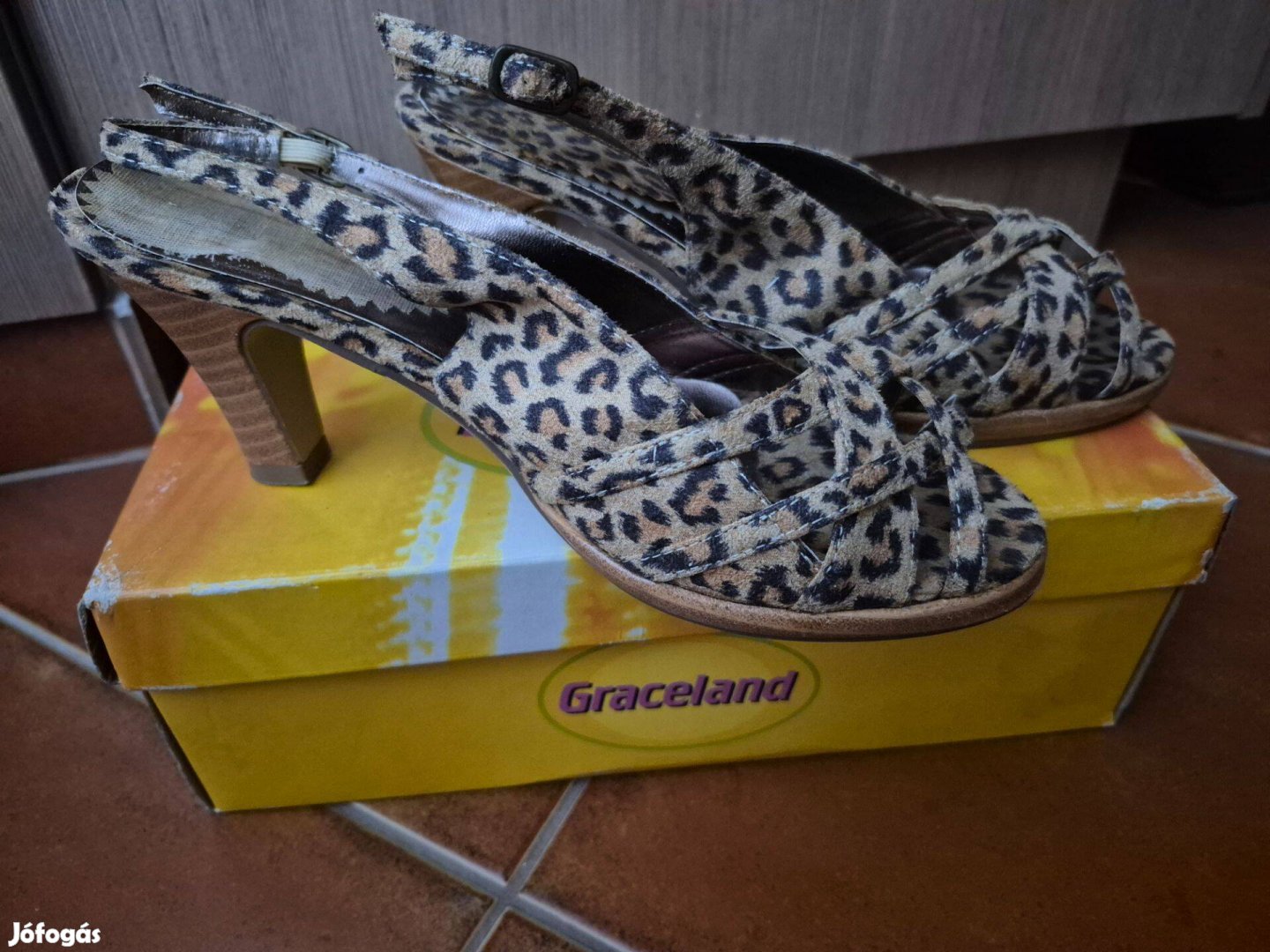 Tigrismintás magassarkú szandál, anyag felsőrésszel