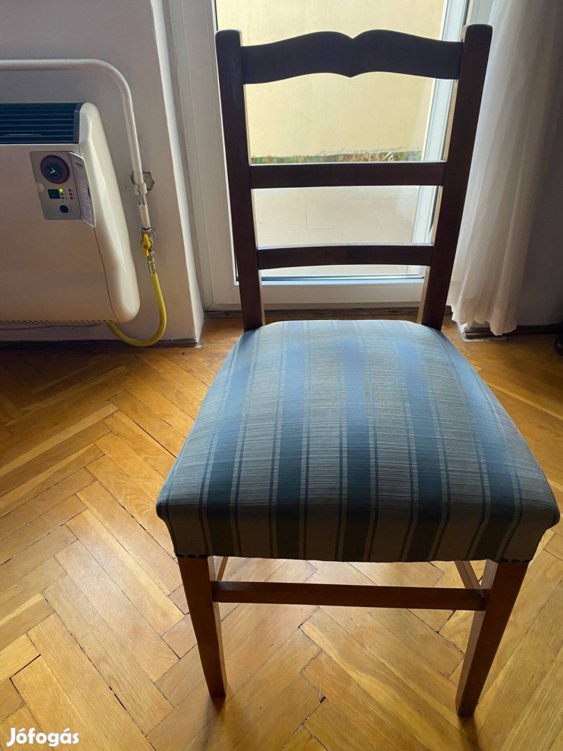 Kárpitos által felújított szék akár étkezőasztalhoz, akár íróasztalhoz. Tömegközlekedéssel is szállítható. Ülőfelület 45 x 43 cm, ülésmagasság 50 cm. Felújítás után alig használt.