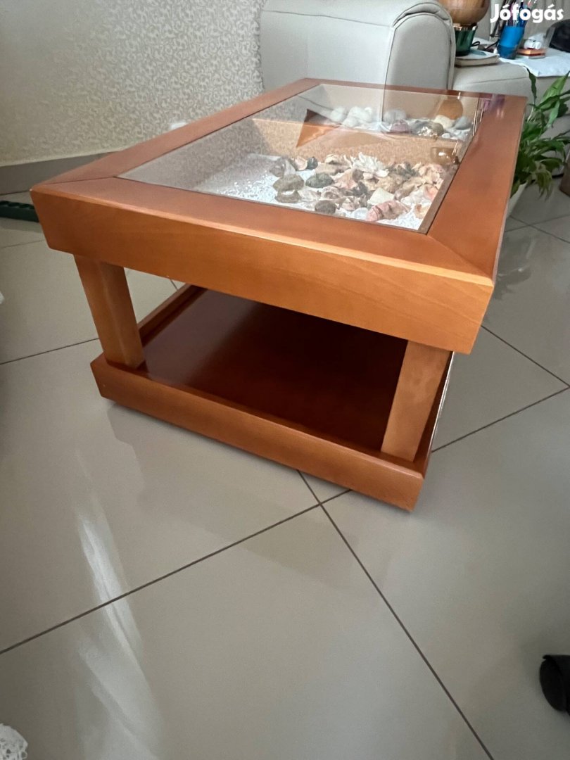 Pácolt tömörfa dohányzó asztal, kivehető törésálló üvegekkel, gurulós aljjal, asztalossal méretre csináltatva.