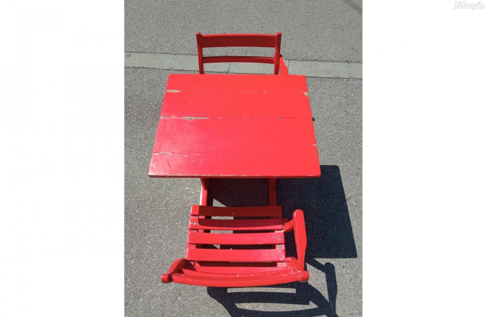 Pirosra festett, fából készült, egyedi gyártású gyerek piknik asztal paddal.