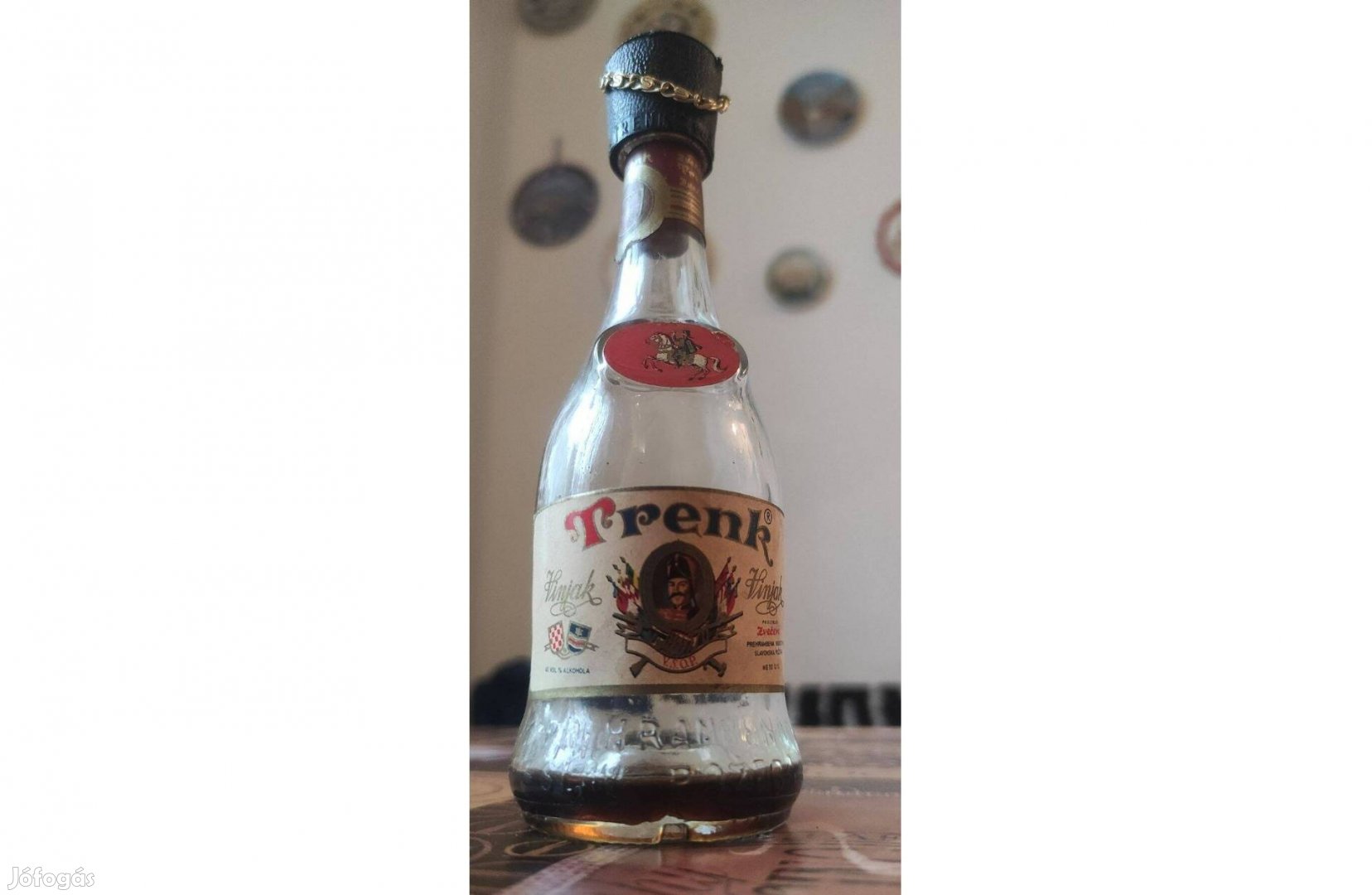 10 cm magas, üres Trenk mini üveg, gyűjtési vagy dekorációs célra ajánlott. Különleges formájával és vintage stílusával remekül mutat polcon vagy vitrines gyűjteményben.