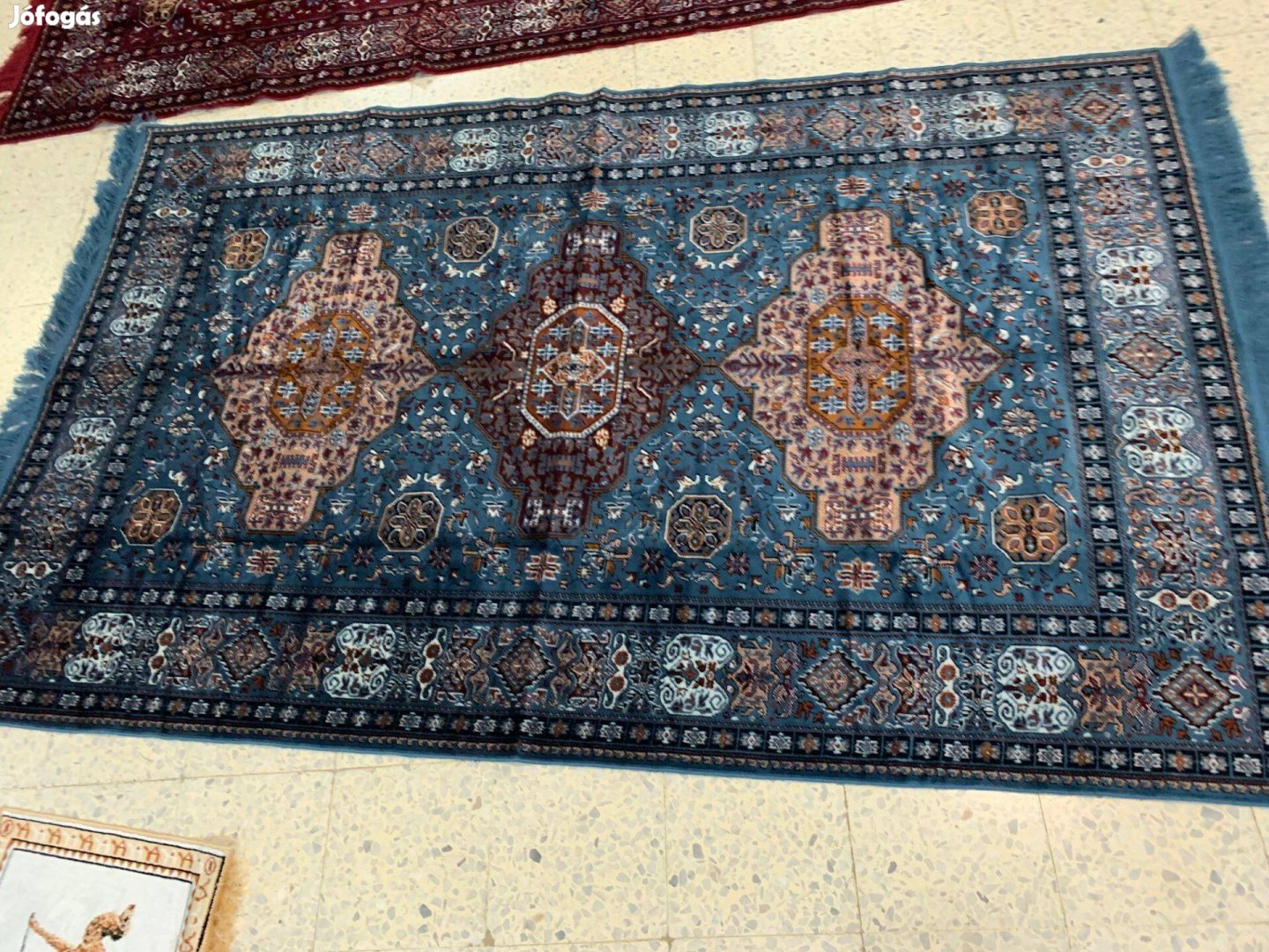 Tunéziában vásárolt teljesen új perzsa mintás (nem perzsa) kék nagyméretű szőnyeg.