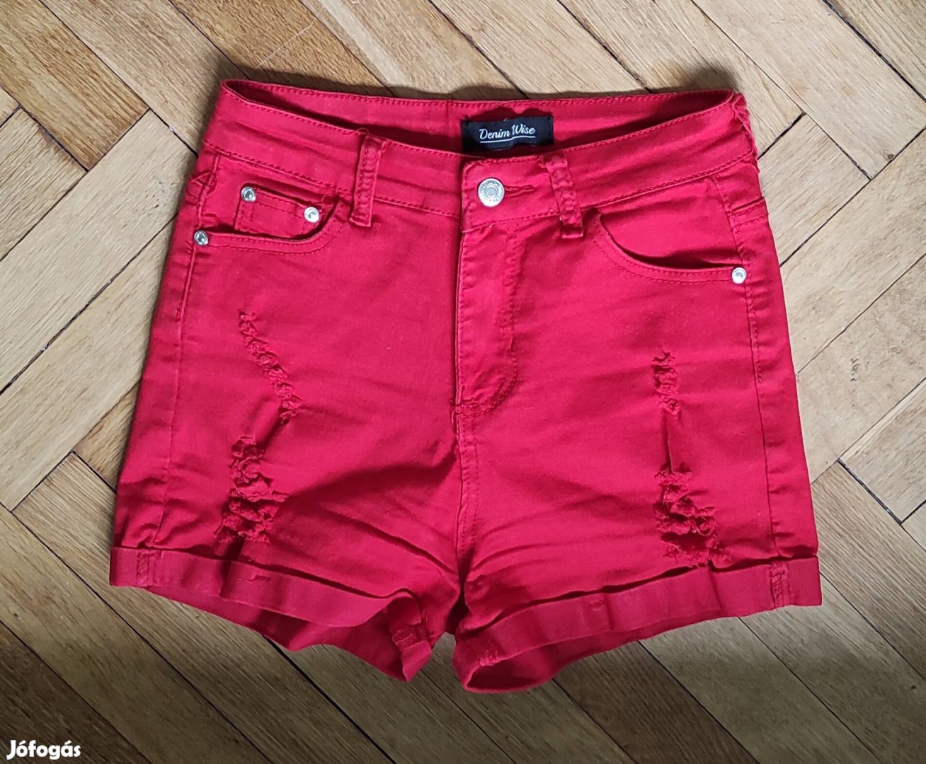 Az első képen látható tűzpiros színárnyalatú, szaggatott farmer rövid nadrág.