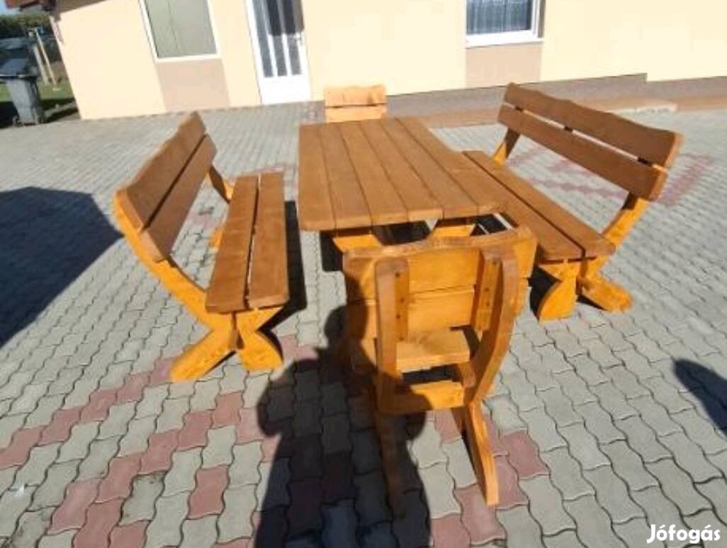 Új Fa kerti garnitúra 2 pad+asztallal , 2 székkel.Borovi Fenyőfaból, Csúcs minőség,lakkozott felület!! Vastag,stabil.több szemelyes!