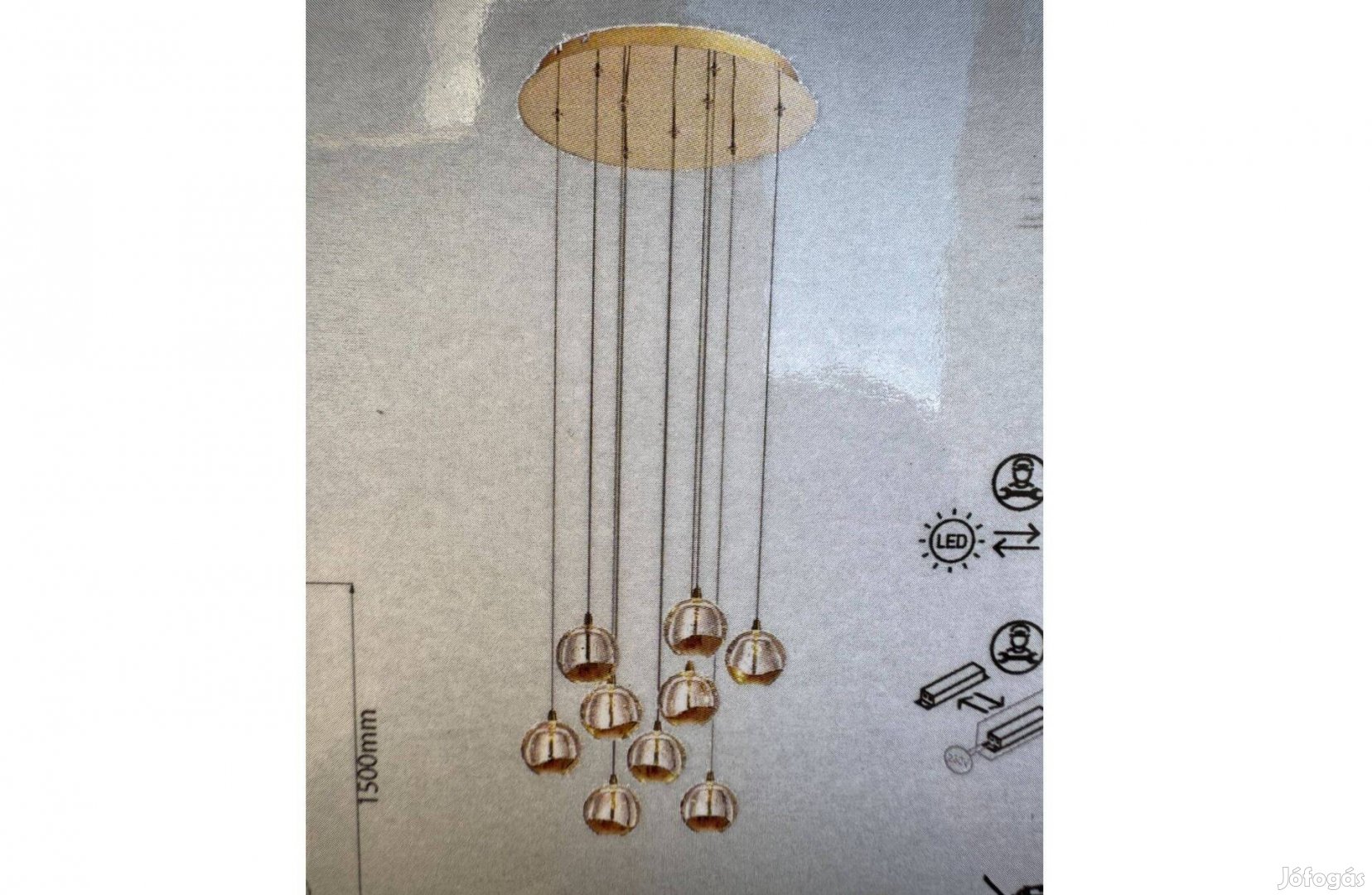 Hayley LED-es függőlámpa kilenc gyönyörű üveggömbbel, elegáns arany kivitelben A különleges Hayley LED-es függőlámpát kifinomult dizájn és modern LED-technológia jellemzi. Mind a kerek baldachin, mind az üveggömb-árnyékolók alját körülvevő filigrán fémelemek arany színű felületet kaptak. A kilenc gömb belseje dekoratívan beépített légbuborékokkal lep meg, amelyek kiemelik a lámpatest egyedi hangulatát. Az állandóan beépített, nagy teljesítményű LED-ek kellemes, meleg fehér fényt bocsátanak ki, amely nagyobb helyiségek megvilágítására is alkalmas. A fény közvetett módon, egyenletesen, káprázás nélkül oszlik el a helyiségben. Ennek a gyönyörű fényforrásnak az elegáns és feltűnő kialakítása a legkülönbözőbb belső terekbe illeszthető, és maradandó benyomást hagy a szemlélőben.