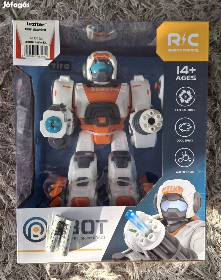 Új, minden irányba mozgós távirányítós nagy méretű robot eladó. Lövedék kilövéssel, vízágyúval. A robot tölthető akkumulátoros, a távirányító elemes.