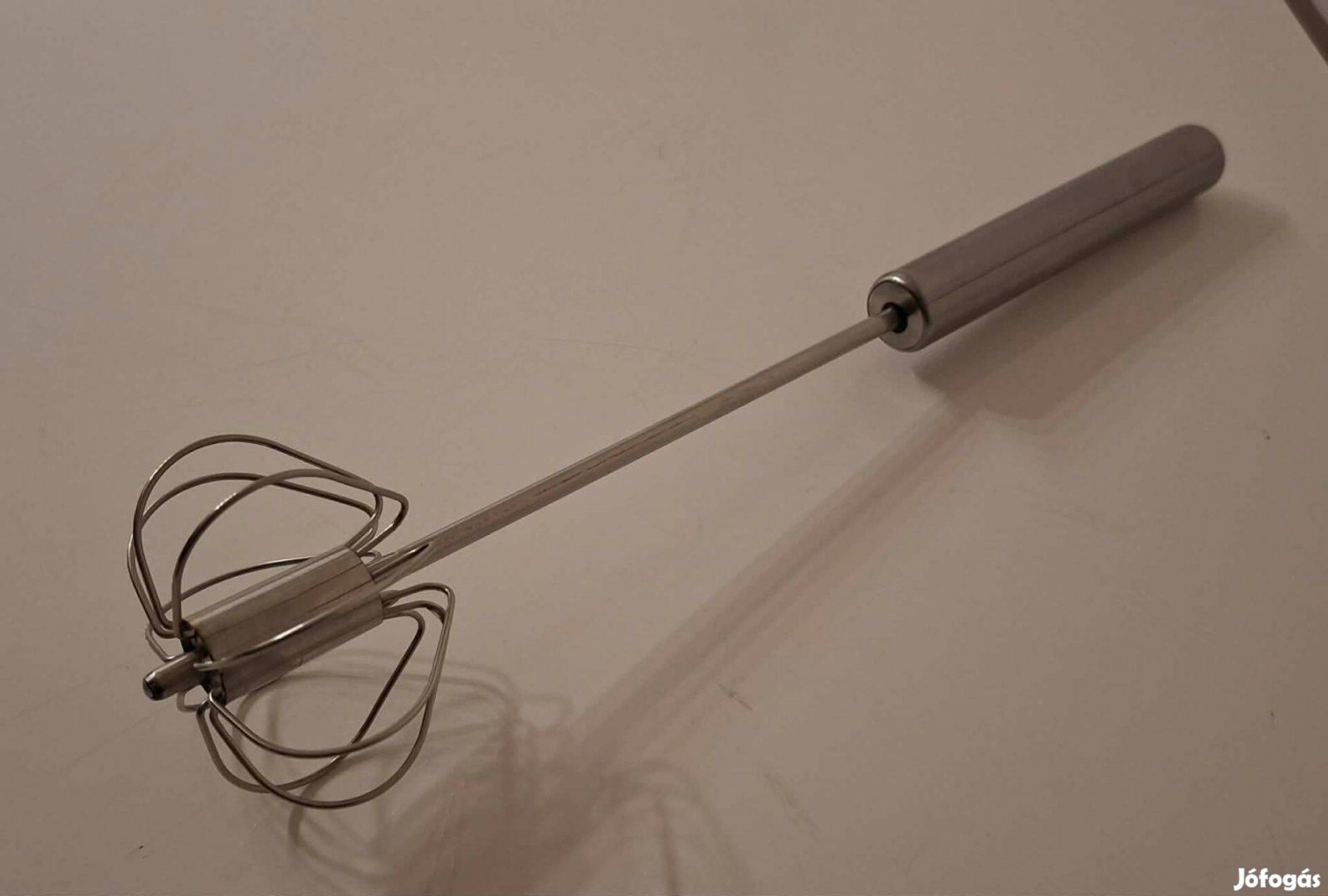 A fogantyú lenyomásával a rugós mechanizmus megforgatja a habverő alsó részét, így elektromosság nélkül lehet keverni a hozzávalókat, pl. tojást/ tejszín/ szószok stb.