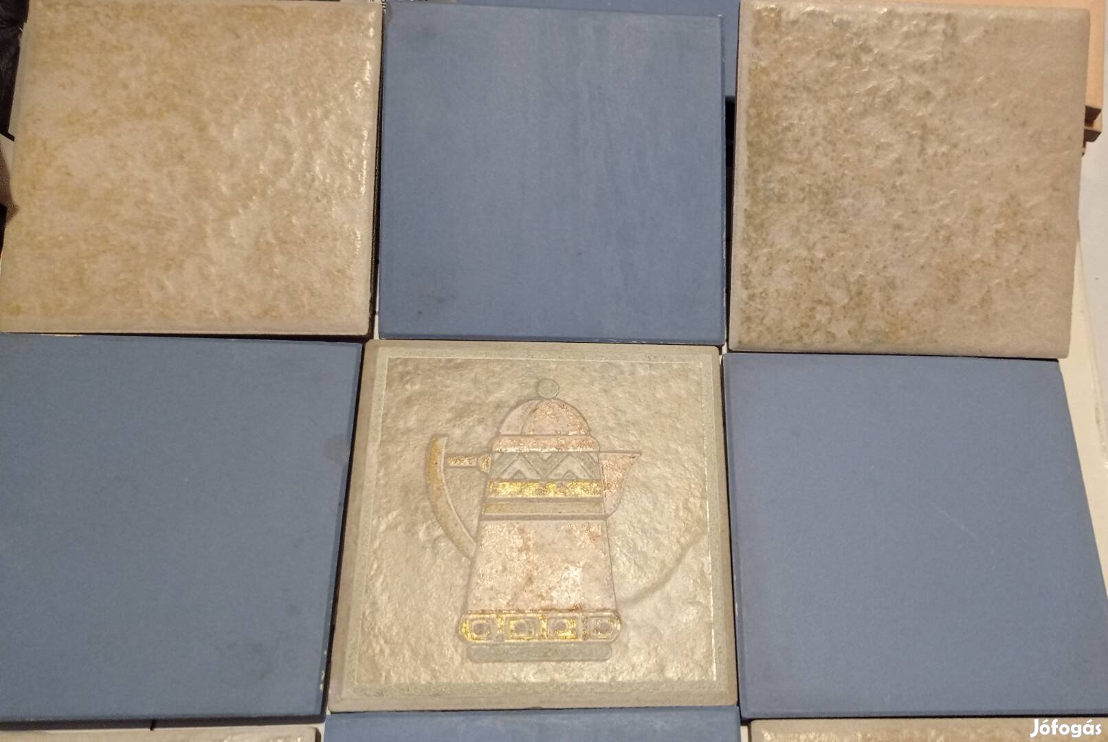 Használt csempék : hullámos felület: 6 db, szürke 4 db és 1 darab mintás . A hátulján maradt meg a ragasztó nyoma. Eleje hibátlan.