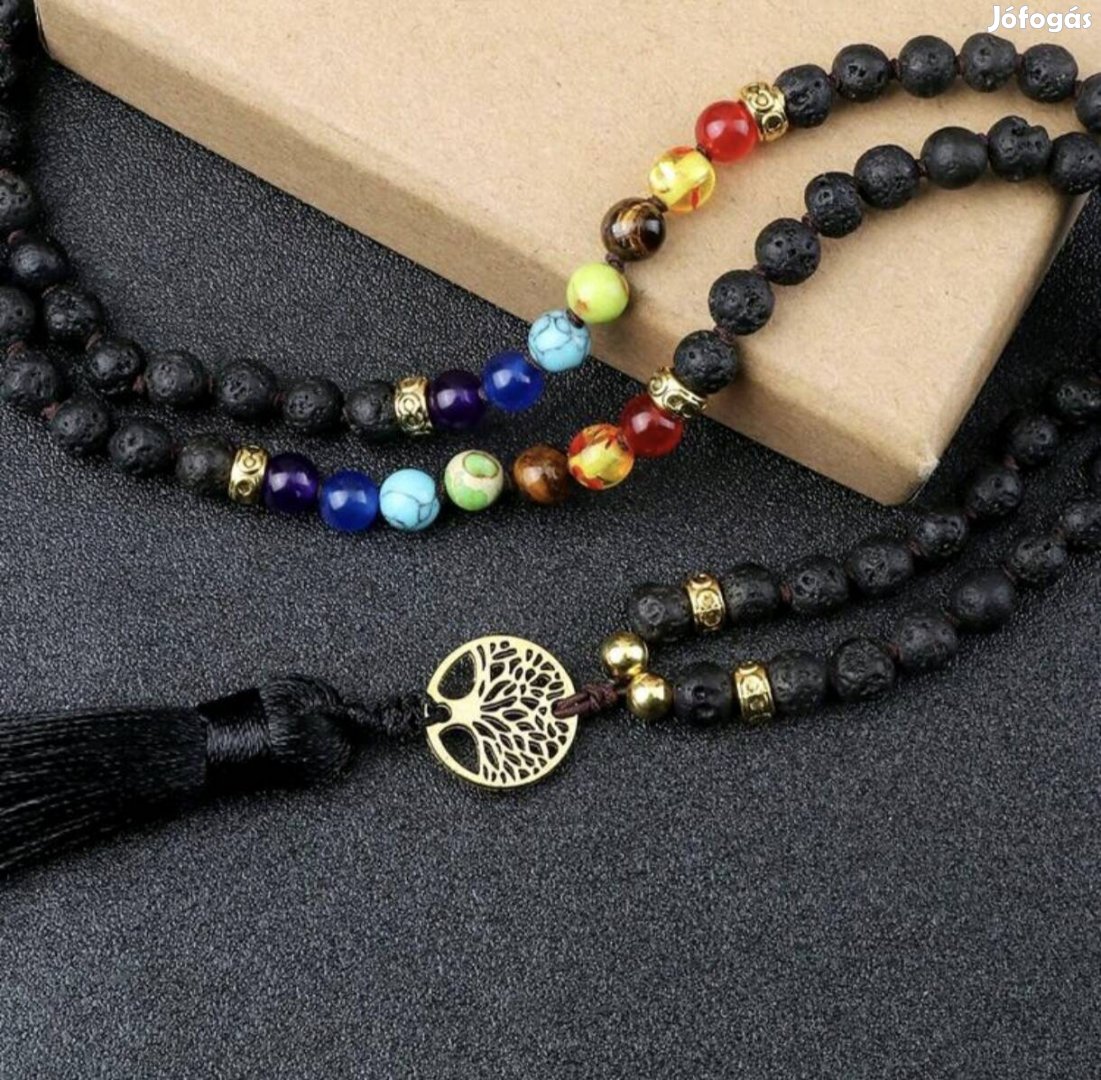 Fekete lávakőből készült gyöngyök + egyéb ásvány gyöngyök, + életfa medál = imalánc, mala, Új.