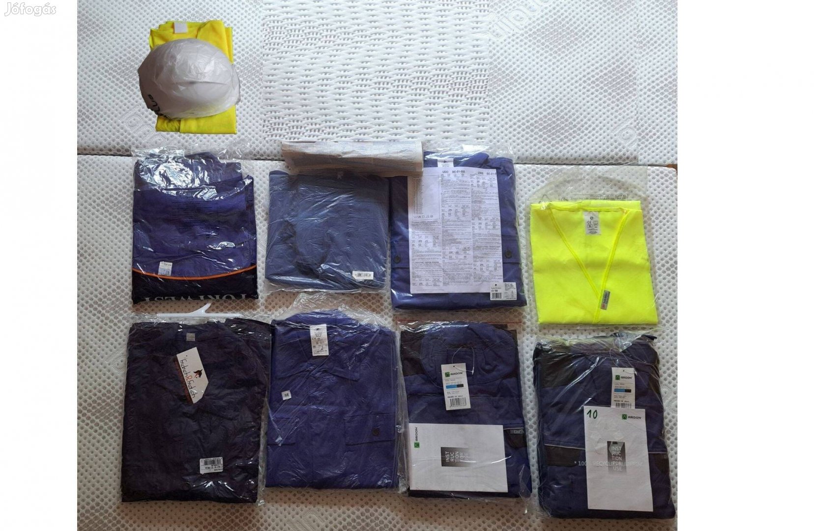 eladó a képen látható raktárkészletről új munkaruha készlet brigádoknak munkásnadrág kantáros nadrág és munkakabát felsőrész munkáskabát szett 182/56 . Csomag tartalma = 1 db kantáros nadrág és munkáskabát (felsőrész), 2db jólláthatósági mellény, 4db munkáskabát (felső), 1db munkavédelmi sisak 1 db bakancs 44 S3,. Mérete 180 cm magasságú emberre való, 56 konfekció méret XL, mindegyik anyaga 100% pamut (vászon és nem műanyag), kék színűek. Adatok a képen, együtt egyben összesen 30ezer Ft-ért eladó. Külön is eladók. MÁS áron