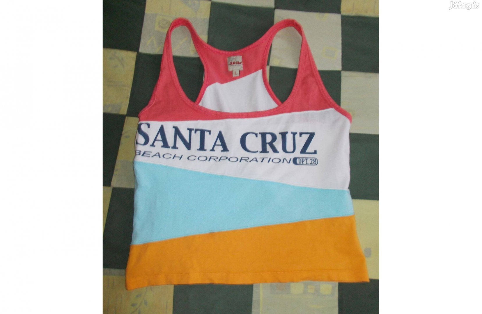 Eladó a képen látható 95% pamut, 5 % elasztán póló, megkímélt állapotú, egy-két alkalommal hordott, méretváltozás miatt. Szélessége mellvonalban 41 cm, háta hossza a pánt csúcsától 49 cm, a belevarrt méretcédula ellenére valójában S-es. Átvehető Budapesten, kérésre postázom.