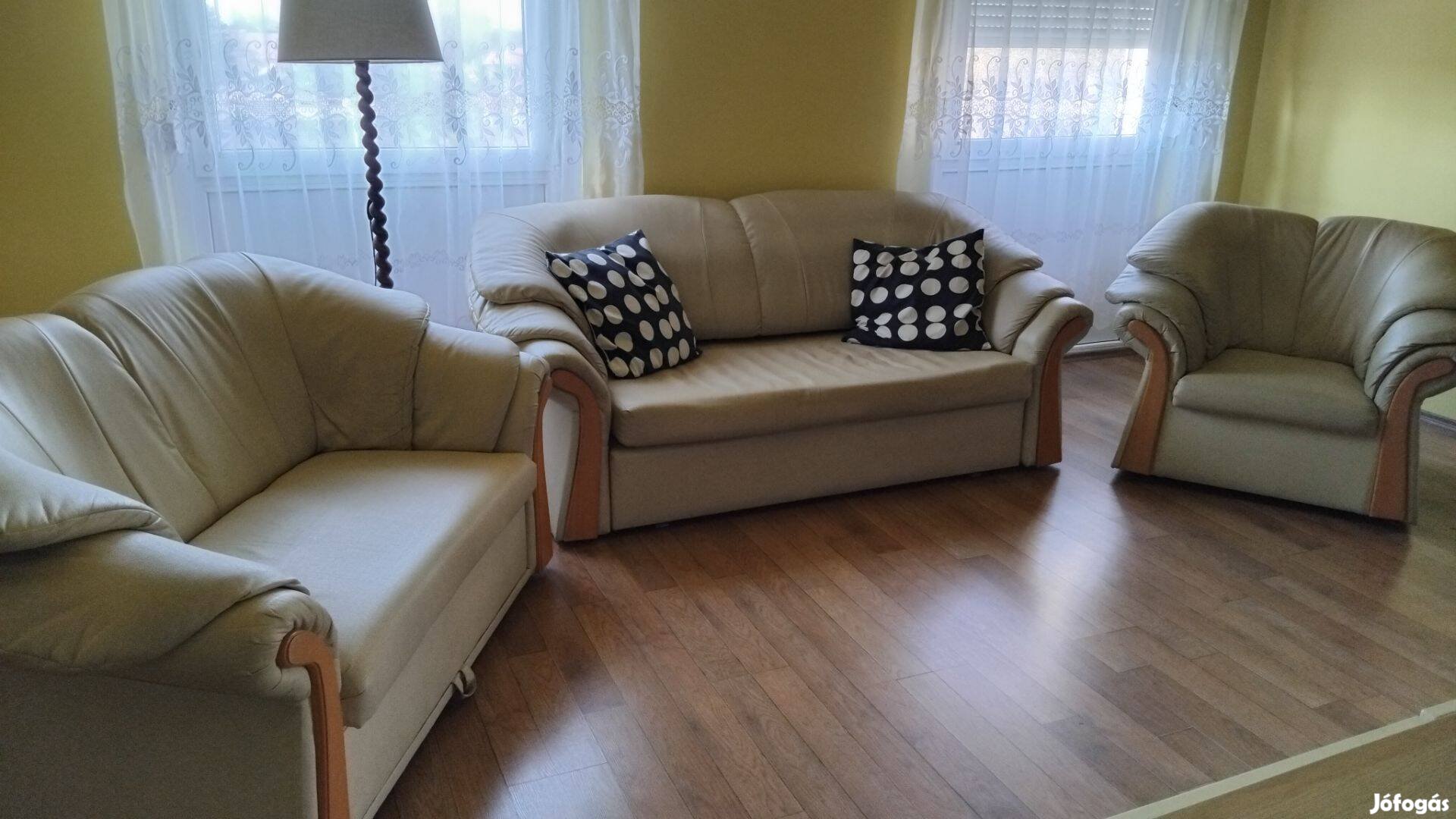 3+2+1 ülőgarnitúra eladó.Vilagos színű,bőrhatásu szövet.Ágyazható.Méretei:3-s:180×85×85 2-s:140×85×85 1-s 95×85×85