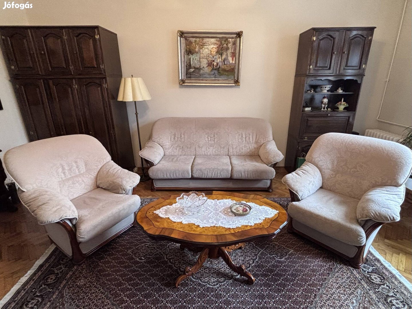 Eladó jó állapotú, klasszikus stílusú, fabetétes, olasz ülőgarnitúra. A kárpit bézs színű bársony. A kanapé nyitható, ágyazható, azonban a szerkezet javításra szorul, mivel jelenleg csak nagyobb erőkifejtéssel nyitható. A garnitúra a kanapéból és két darab fotelből áll.